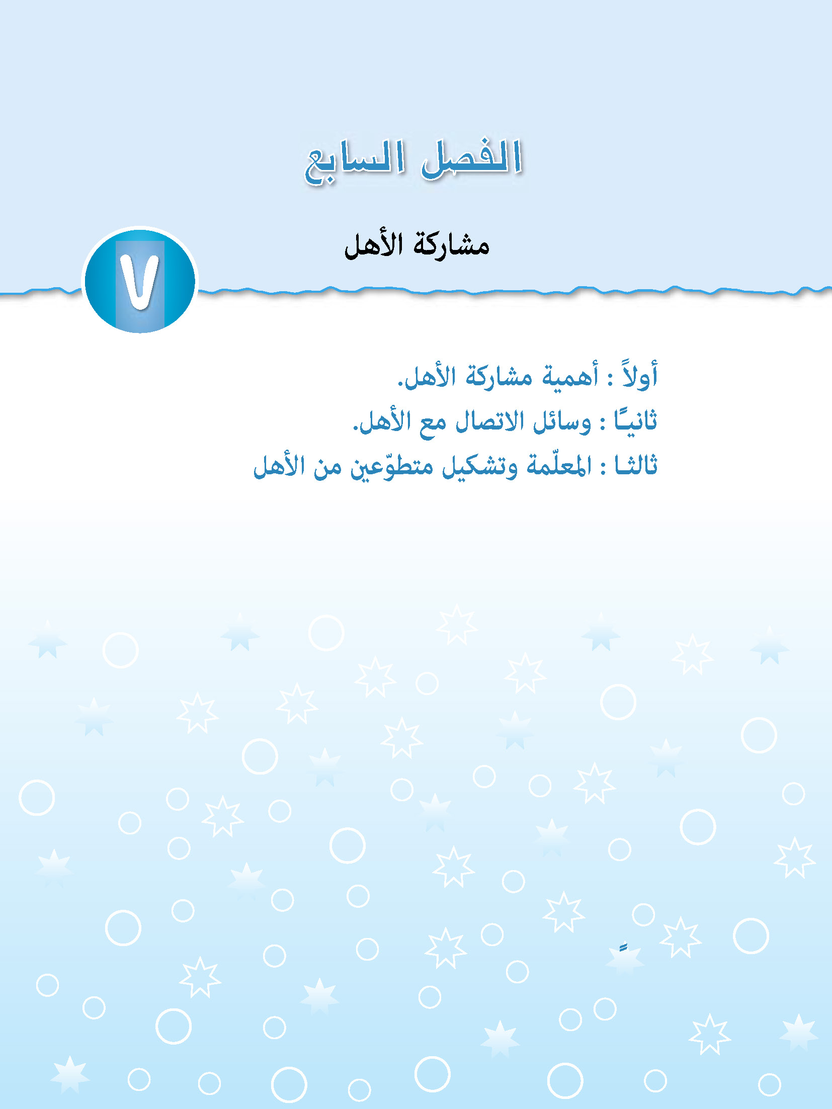 يقدّم هذا الفصل وصفًا مفصّلًا عن مشاركة الأهل في عملية التعليم الخاصة بأطفالهم، وسائل الإتصال معهم وطرق تفعيلها.