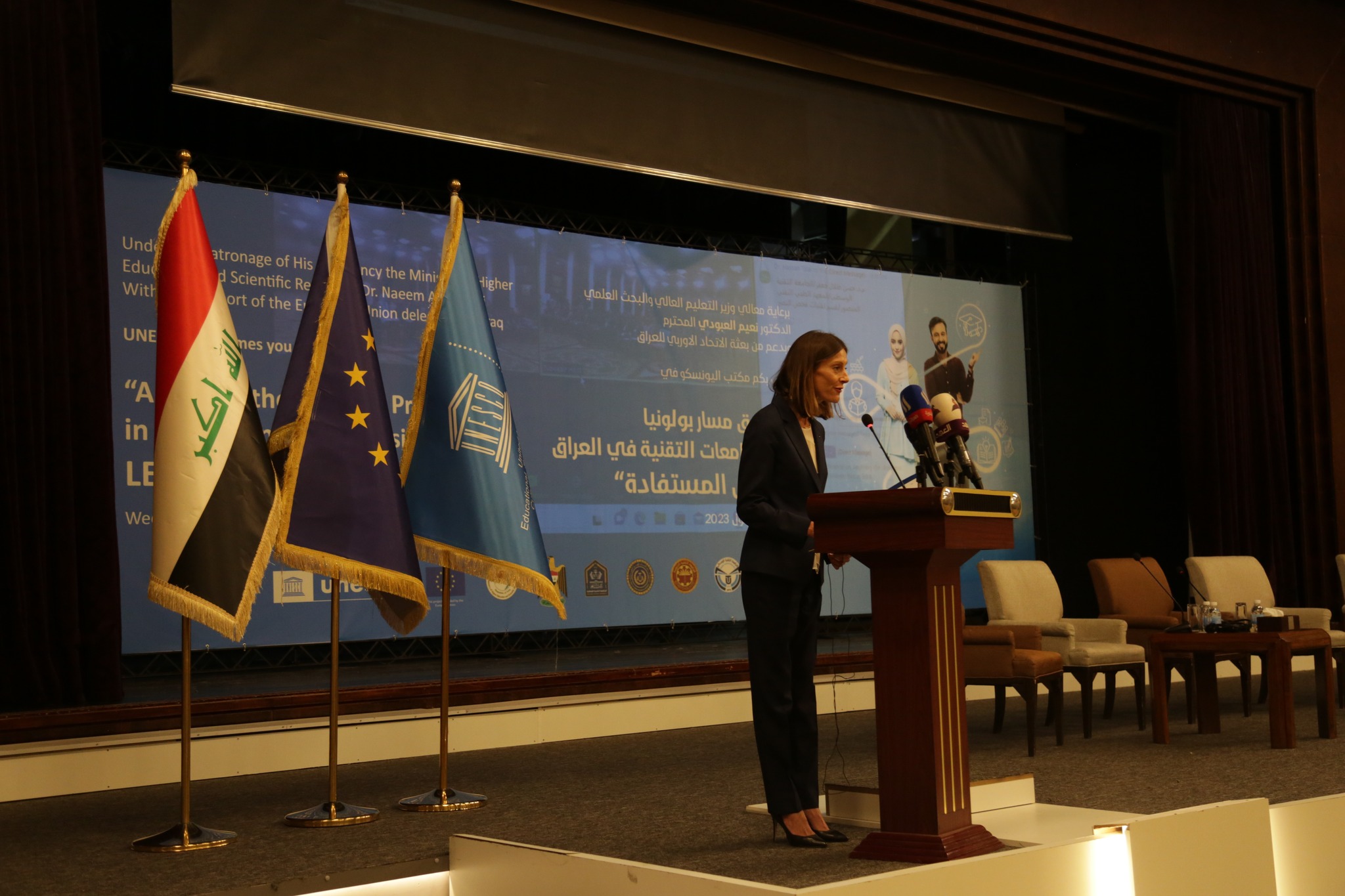 استضاف مكتب اليونسكو في العراق مؤتمراً في 20 أيلول/سبتمبر2023 بعنوان " تطبيق مسار بولونيا في الجامعات التقنية في العراق: الدروس المستفادة"، بالتعاون مع بعثة الاتحاد الأوروبي، وبحضور أصحاب المصلحة الرئيسيين، بما في ذلك ممثلو الاتحاد الأوروبي واليونسكو، ووزير التعليم العالي والبحث العلمي الدكتور نعيم العبودي، مستشار رئيس الوزراء الدكتور حامد خلف، وقيادات الجامعات، والمديرين العامين، والأكاديميين.