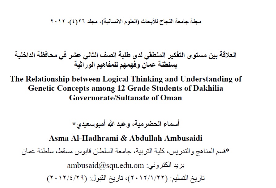 العلاقة بين مستوى التفكير المنطقي لدى طلبة الصف الثاني عشر في محافظة الداخلية بسلطنة عمان الوراثية وفھمھم للمفاھيم