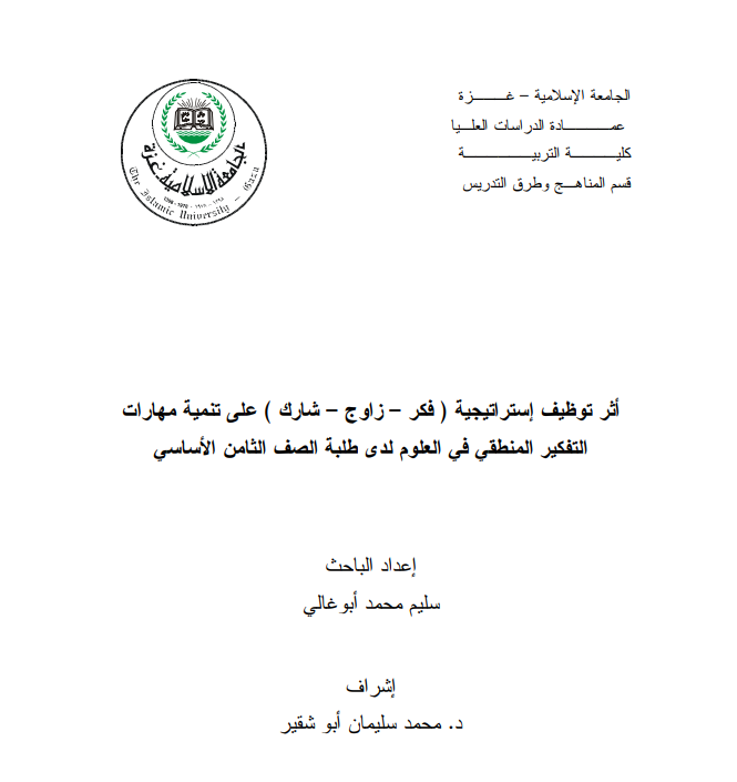 هدفت هذه الدراسة إلى معرفة أثر توظيف إستراتيجية (فكر-زاوج-شارك) على تنمية مهارات التفكير المنطقي في العلوم لدى طلبة الصف الثامن الأساسي، وقدم الباحث مجموعة من التوصيات للقائمين على العملية التعليمية التي من شأنها أن تحدث تغييراً في تنمية مهارات التفكير المنطقي في مراحل التعليم المختلفة نذكر أهمها : ضرورة استخدام إستراتيجيات التدريس الحديثة و منها إستراتيجية (فكر-زاوج-شارك) في تعلم العلوم من قبل المعلمين و الموجهين و الطلبة كأحد الأساليب الفعالة للتعلم.